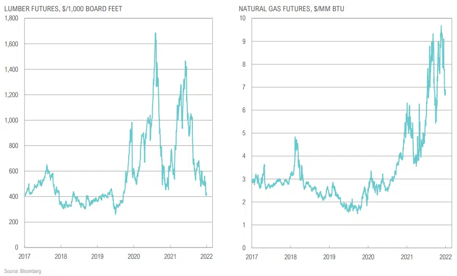 Dispersion within commodities: lumber futures were down another 36% over the quarter while natural gas futures gained 25%; natural gas futures are 30% off August peak
