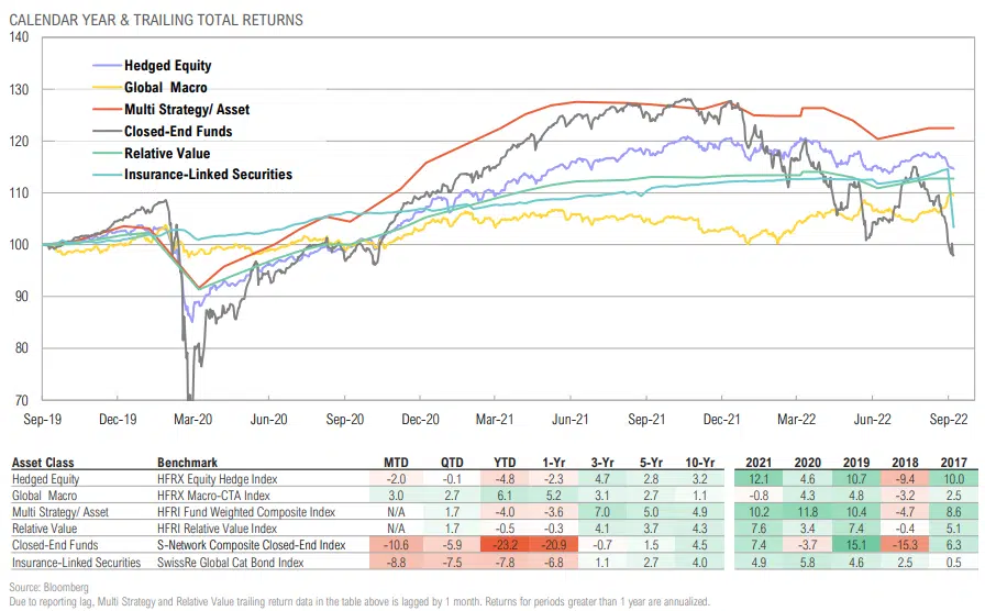 Insurance-linked securities was the worst performing opportunistic asset class in Q3 as hurricane Ian threatens heavy losses; global macro is the only positive asset class YTD