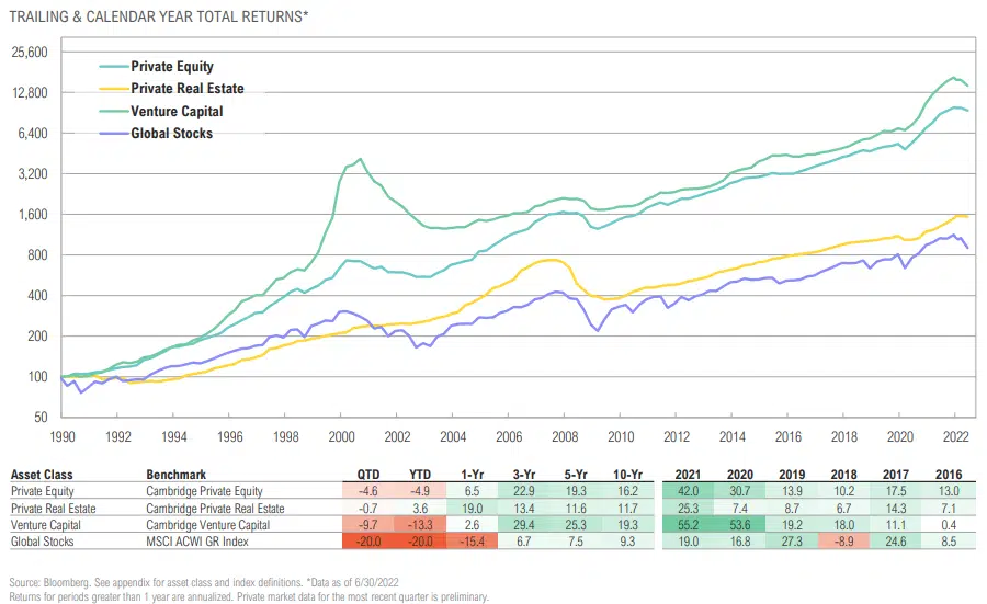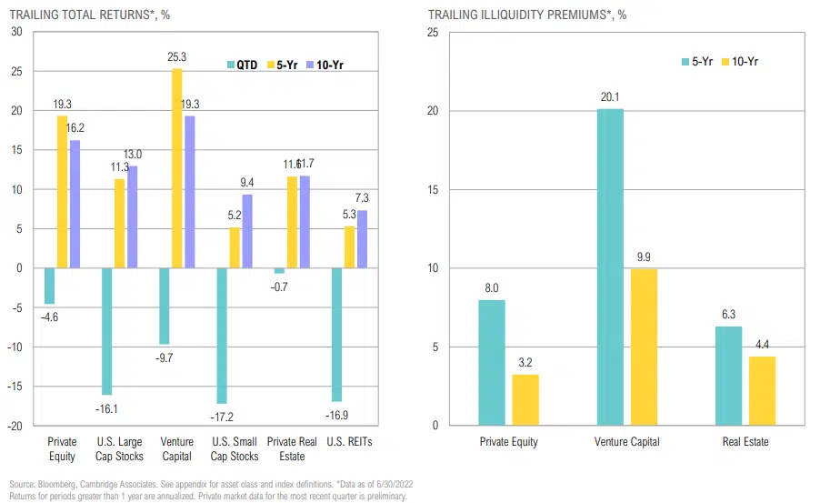 Trailing 5-year periods have seen unusually high illiquidity premiums, which will likely mean revert as valuations and appraisals catch down to public markets