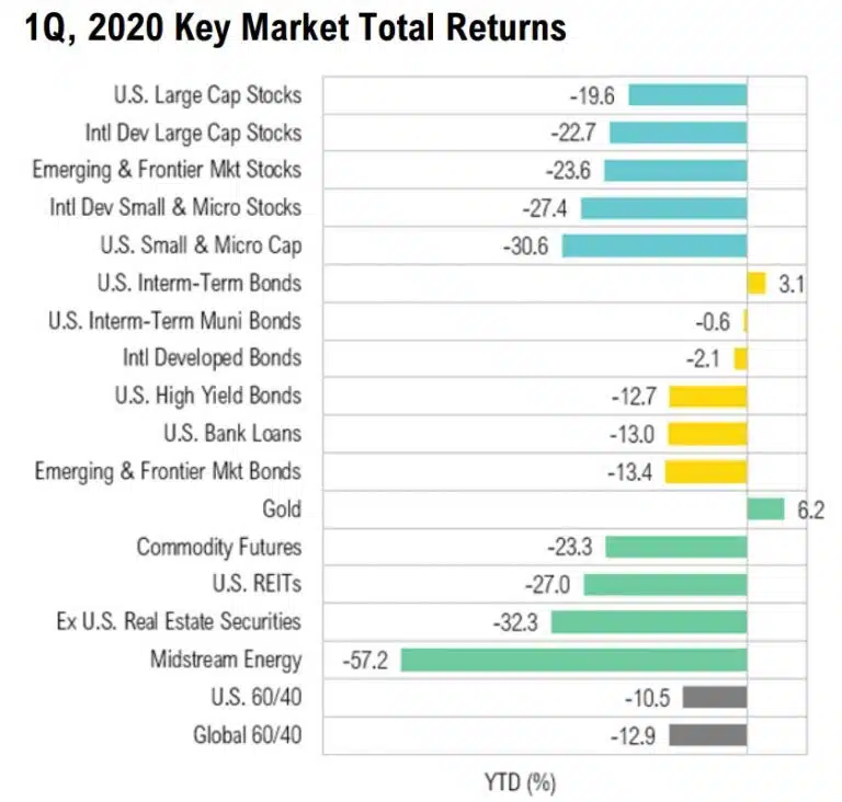 Asset class performance was measured using the following benchmarks: U.S. Large Cap Stocks: S&P 500 TR Index; U.S. Small & Micro Cap: Russell 2000 TR Index; Intl Dev Large Cap Stocks: MSCI EAFE GR Index; Emerging & Frontier Market Stocks: MSCI Emerging Markets GR Index; U.S. Intermediate-Term Muni Bonds: Bloomberg Barclays 1-10 (1-12 Yr) Muni Bond TR Index; U.S. Intermediate-Term Bonds: Bloomberg Barclays U.S. Aggregate Bond TR Index; U.S. High Yield Bonds: Bloomberg Barclays U.S. Corporate High Yield TR Index; U.S. Bank Loans: S&P/LSTA U.S. Leveraged Loan Index; Intl Developed Bonds: Bloomberg Barclays Global Aggregate ex-U.S. Index; Emerging & Frontier Market Bonds: JPMorgan EMBI Global Diversified TR Index; U.S. REITs: MSCI U.S. REIT GR Index, Ex U.S. Real Estate Securities: S&P Global Ex-U.S. Property TR Index; Commodity Futures: Bloomberg Commodity TR Index; Midstream Energy: Alerian MLP TR Index; Gold: LBMA Gold Price, U.S. 60/40: 60% S&P 500 TR Index; 40% Bloomberg Barclays U.S. Aggregate Bond TR Index; Global 60/40: 60% MSCI ACWI GR Index; 40% Bloomberg Barclays Global Aggregate Bond TR Index.