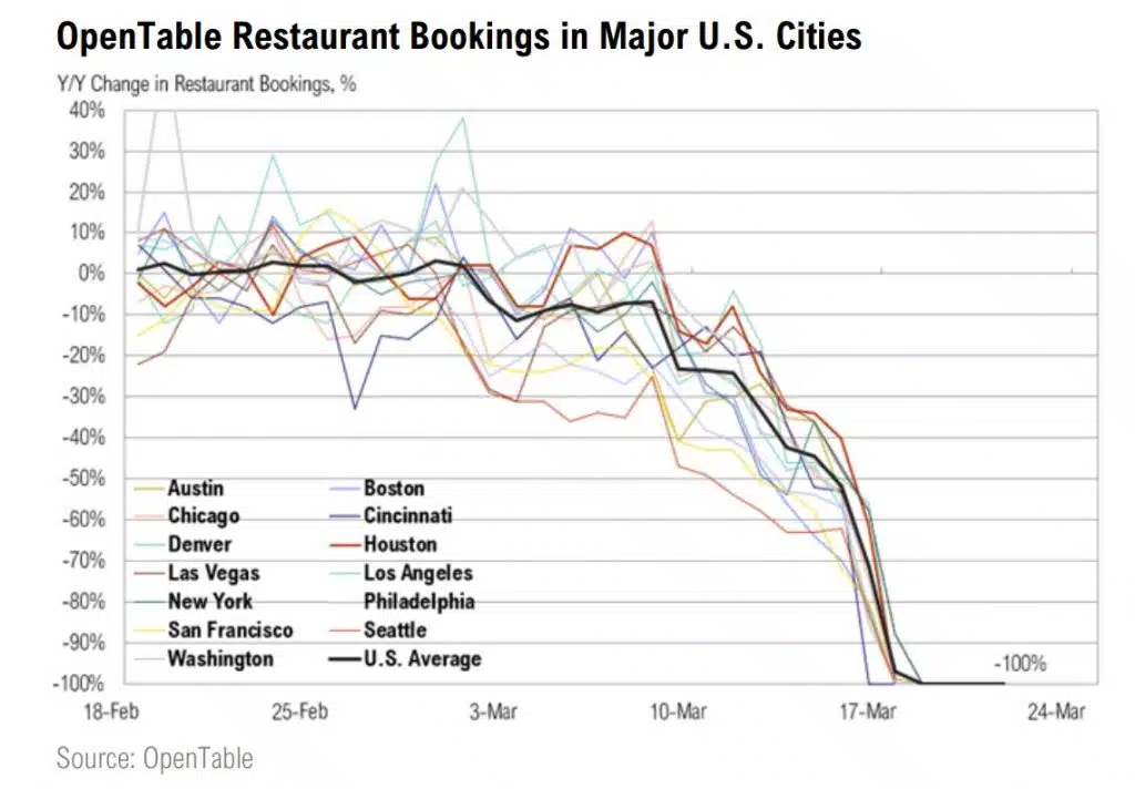 Other non-traditional measures of economic activity also reveal the consequences of the shutdown. On a normal day, roughly two million airline passengers present their boarding passes to TSA agents. During late March, that number fell to just 275,000, down almost 90%. The TomTom Congestion Index, a measure of car traffic, shows a similar situation. Los Angeles traffic is down almost 80% relative to a typical, pre-Coronavirus week. Data released by restaurant reservation website OpenTable showed 100% declines in dine-in reservations for most major cities in the U.S. Mall traffic, concert and sporting event attendance, and all other activities deemed “non-essential” have effectively dropped to zero in much of the world.