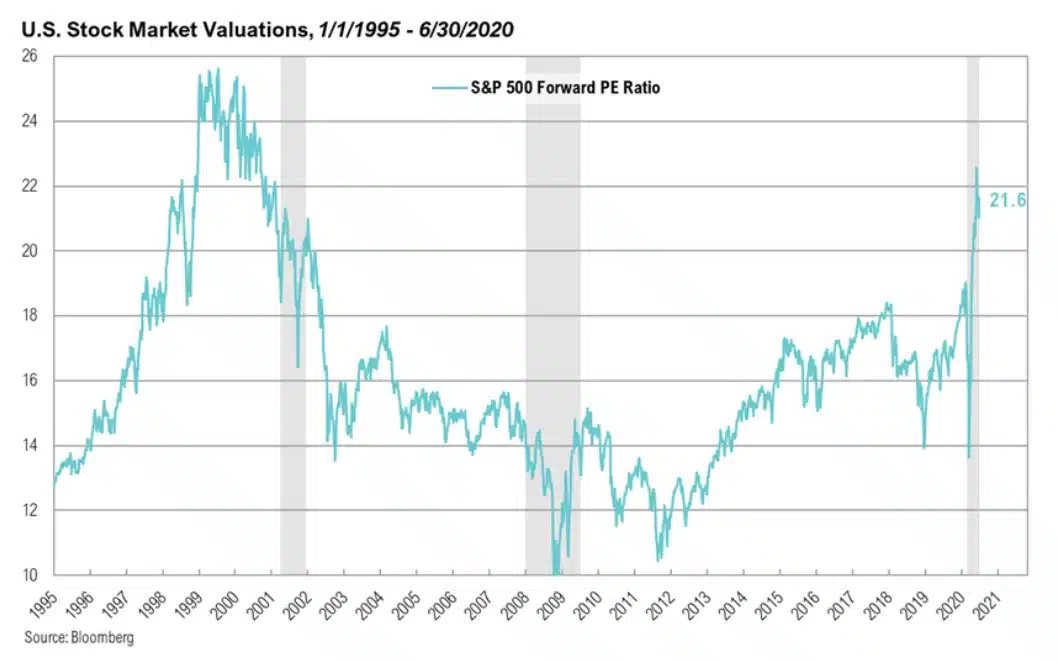 The enormous rally in stocks and massive downward revisions in corporate earnings, as a result of COVID-19, have created the tech bubble dynamic in the form of extremely high valuations. The one-year forward P/E ratio for the S&P 500 sits at nearly 22 times, which resembles the tech bubble when it was at approximately 26 times. Part of the reason for the significant rise in equity prices during the second quarter was the euphoria (and relief) of a partial re-opening of the economy. As the numerator (prices) in that equation rose substantially, the denominator (earnings expectations) plummeted. Consensus estimates for S&P 500 earnings per share (EPS) for 2020 were cut by over 28% from $174 on January 1 to $125 at the end of June.5 Forecasts for 2021 and 2022 EPS have also been cut by 17% and 10%, respectively.5