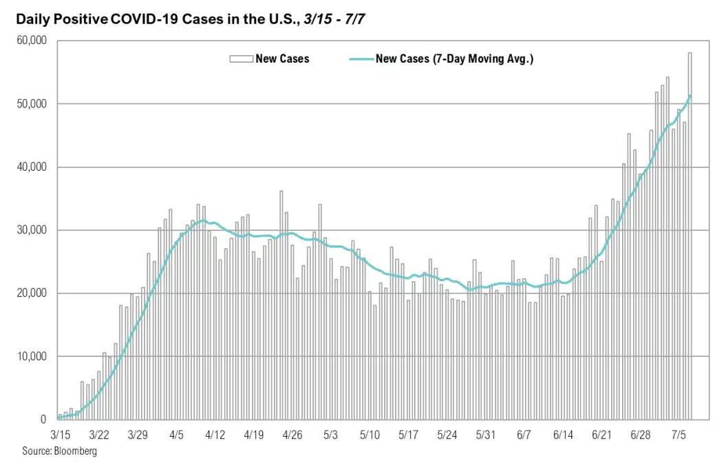 Unfortunately, absent a vaccine or effective therapeutics to address the virus, additional fiscal and monetary support will likely be needed in the second half of the year. A recent study by Austan Goolsbee and Chad Syverson of the Becker Friedman Institute for Economics at the University of Chicago addressed the question of how much of the economic collapse resulted from government-imposed restrictions versus people voluntarily choosing to stay home to avoid infection.10 Using cellular phone data from SafeGraph, which collects information on almost 45 million cellular phone users (or about 10% of devices in the U.S.), they estimated overall consumer foot traffic fell by 60%—only 7% of that reduction due to legal restrictions. This appears to continue to be the case. According to SafeGraph, in states where positive cases are on the rise—such as Florida, Texas, Arizona, and California—foot traffic remains at depressed levels or has deteriorated into July.11 Other data point to a similar lull in activity. According to TSA travel checkpoints, the number of airplane passengers in the last seven days of the quarter averaged just 579,000—or down 77% from the same period last year.12 OpenTable data revealed that reservations at sit-in restaurants declined over the past few weeks and are down more than 60% when compared to last year.13 This all comes = at a time when new COVID-19 cases are exceeding 50,000 per day in the U.S.14