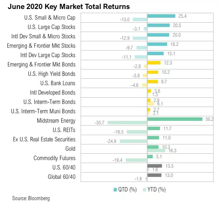 As tumultuous as the first quarter of 2020 was, the second quarter was almost a perfect mirror image. Many asset classes recovered to end the first half of the year at levels that show no signs of a bear market, let alone a global economic shutdown. For the quarter, the S&P 500 gained 21% while the tech-heavy NASDAQ increased 31%. This leaves the S&P 500 down 3% for the year while the NASDAQ is higher by 12%! High-yield bonds finished the quarter by gaining 10% and are down just 4% in 2020.