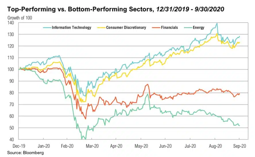 On the surface, these relatively mundane returns were surprising, considering that the underlying economy remains incredibly uneven. However, in terms of sector returns, this year has been feast or famine. On the feast side, the technology sector, which represents approximately one-quarter of the S&P 500, is up 29% year to date. Conversely, the energy and financial sectors, which combine to represent a smaller, but still significant, 15% of the index, are down 48% and 20%, respectively. The spread between the best and worst performing sectors is 78%—the highest it’s been since 2000 when utilities were up 51% and materials were down 31%. Given the wide dispersion of sector returns, the considerable disparity between growth and value stock returns is unsurprising. So far in 2020, large cap growth stocks, as measured by the Russell 1000 Growth Index, are higher by 24% while the Russell 1000 Value Index is down 12%. Similarly, the spread between small cap growth stocks, as measured by the Russell 2000 Growth Index, and small cap value stocks, as measured by the Russell 2000 Value Index, is 26%. To provide some context, at the height of the tech bubble in 1999, the difference between large cap growth and value stock returns was 20%. In 1999, large cap growth stocks outperformed small cap value stocks by 35%, but year to date, that spread is 46%, as small cap value stocks are down 22%.