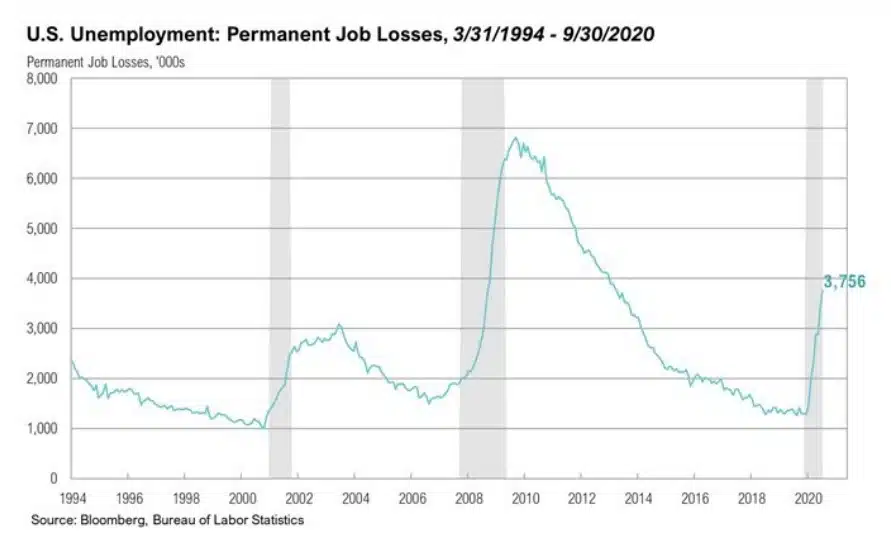 Whether justified or not, the Fed has scaled up its already far-reaching power in proportion to the size of the pandemic. It has also explicitly called for further fiscal stimulus, focusing especially on a labor market that remains in distress, even as headline jobs numbers have improved. Continuing jobless claims have moved lower off all-time highs, dropping from nearly 25 million to 11 million.5 The unemployment rate has improved from 15% to 8%.6 However, if you include all of the assistance programs launched during the pandemic, the number of Americans receiving government support as a result of job losses is close to 25 million, approximately 15% of the 160 million people in the workforce.5,7 Permanent job losses—a specific point of concern for policymaker-—are also increasing at a faster rate than during the prior two recessions.8 Layoffs in industries such as airlines, which are inevitable without further government support, would only push the permanent job loss number higher.