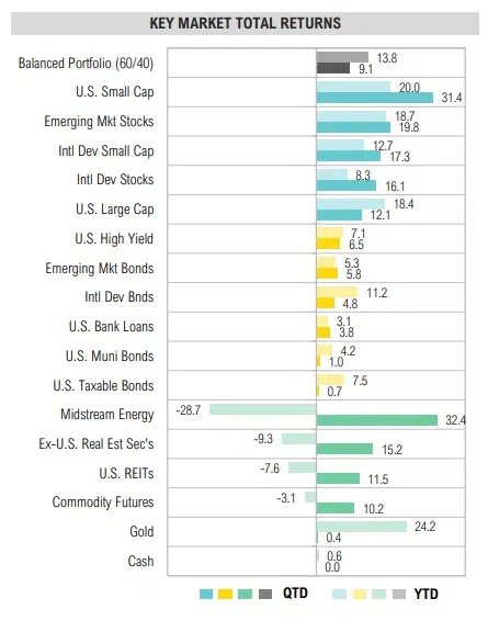 - Risky assets surged with S. small cap stocks (+31.4%) and midstream energy assets (+32.4%) being notable top-performers.