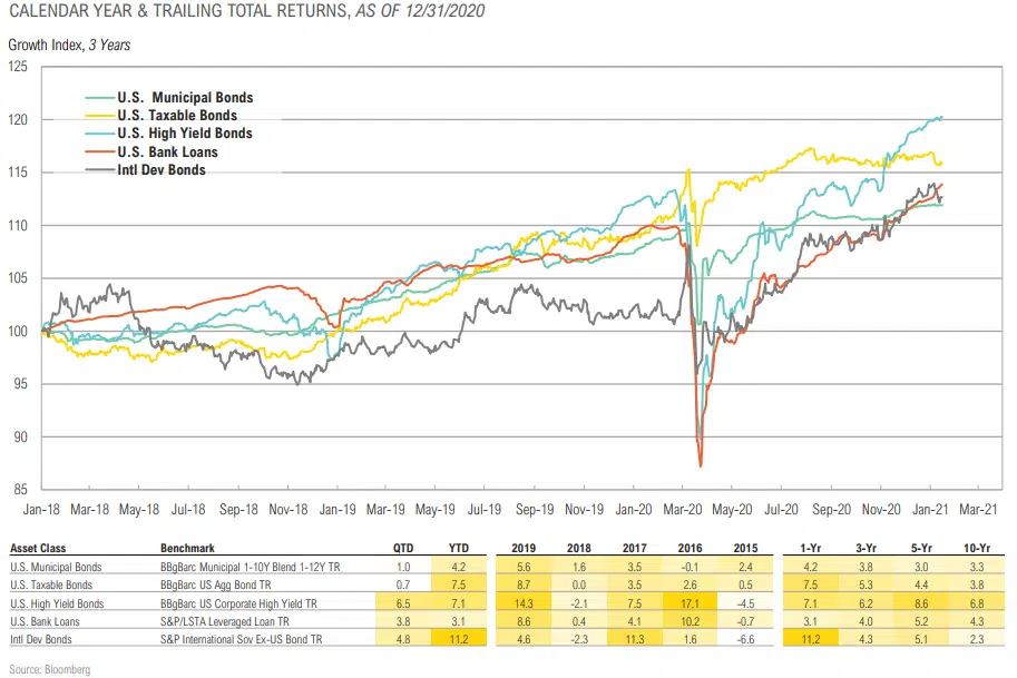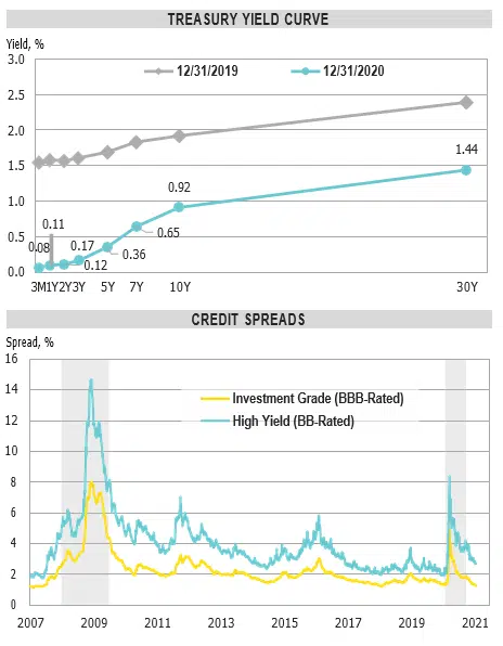 - All fixed income and credit sectors rallied for the quarter as rates rose modestly, but credit spreads narrowed on continued support by the Federal Reserve and an overall increase in risk appetite.