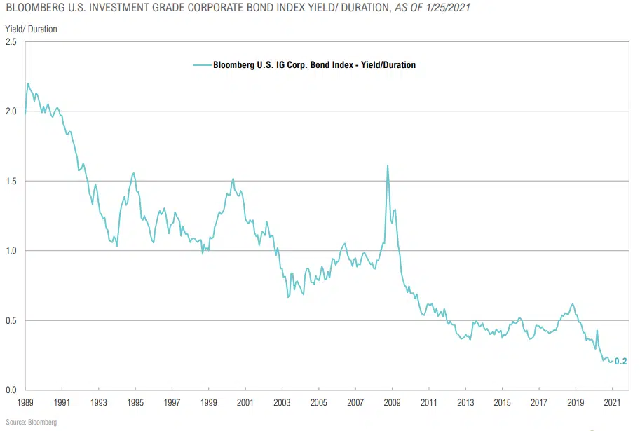 - The yield on a diversified portfolio of global stocks and S. bonds declined to ~1.5%, an all-time low.
