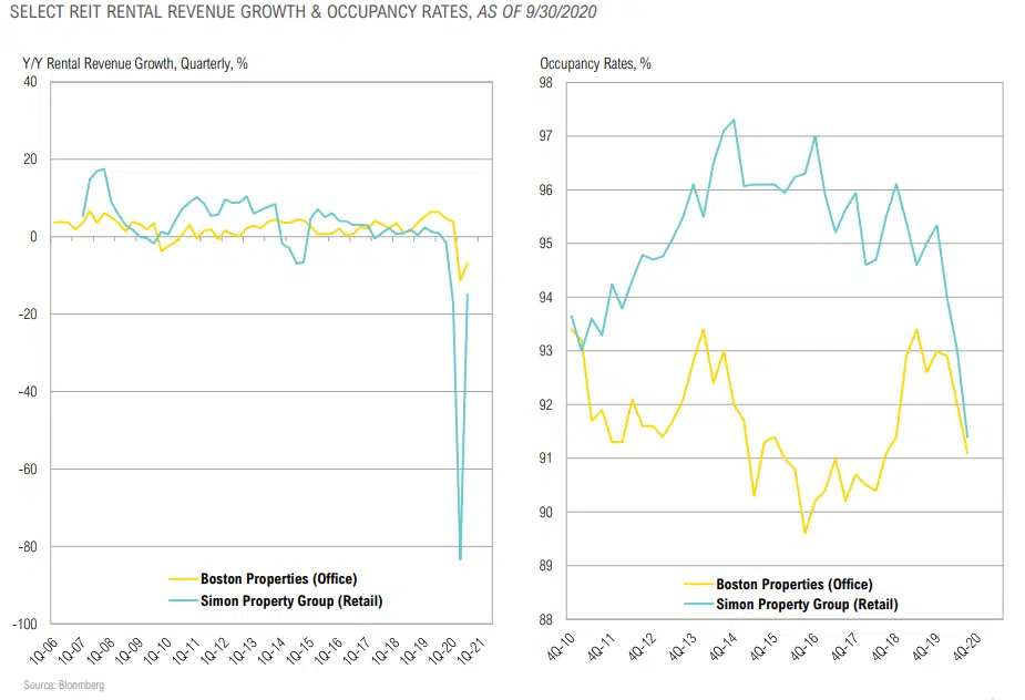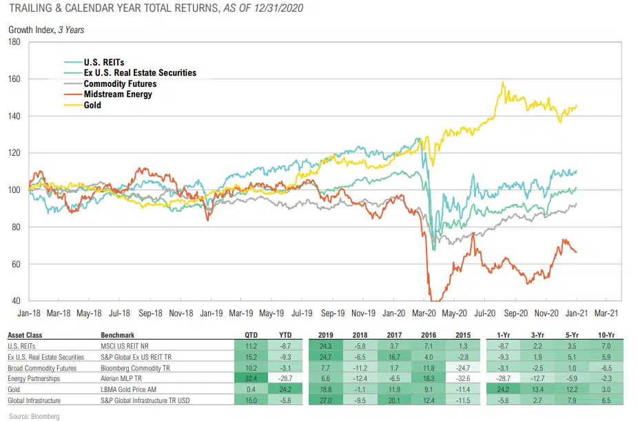 - Commercial real estate is at the epicenter of redefining normal as we exit the Covid-19 crisis. Shifts in corporate headquarters, flight from urban areas and flexible work environments foster continued uncertainty. REITs were down 7.6% in 2020.