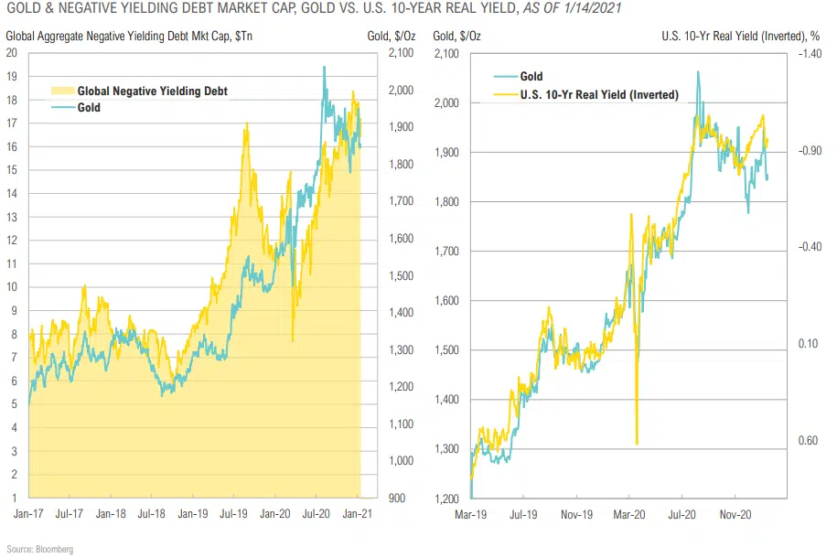 - Gold will continue to benefit if the pool of negative-yielding sovereign debt (>$16 trillion now) grows or fiscal spending/quantitative easing programs persist.