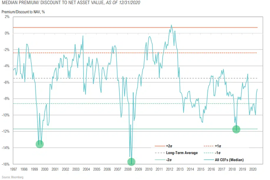 - The closed-end funds space is less attractive as discounts have narrowed to roughly 7%, not much wider than the longterm average of about 5%.