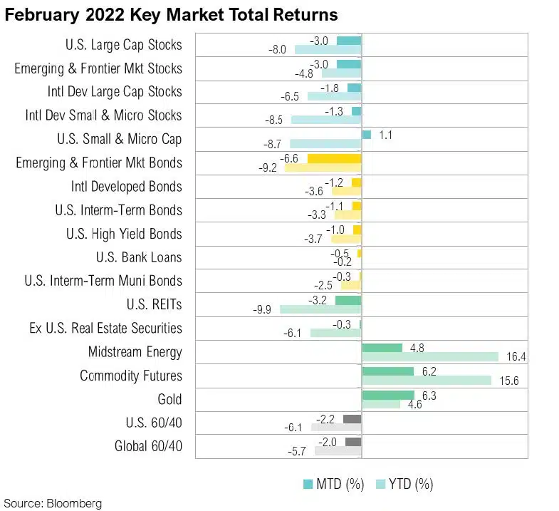 Just before dawn on February 24, 2022, explosions rang out across major Ukrainian cities as Russia invaded its neighbor to the west. The move, according to policy experts at The Brookings Institution, represents an attempt by Vladimir Putin to stop NATO’s eastward creep and restore the map of Europe—and Russia’s role on the continent—to its pre-NATO glory.1 In the days following the invasion, most Western countries responded with support, ranging from military equipment to economic sanctions.2,3 February’s market tape bore some scratches but few scars from the conflict, as losses were stemmed by a late-month rally in stocks. Global balanced portfolios, proxied by a blend of 60% global stocks and 40% global bonds, declined just 2%. Crude oil ended the month at almost $96/barrel, up $8 for the month. Gold rallied to $1,911/ounce on its perceived role as a safe haven, and the U.S. 10-year Treasury Note yield rose 6 basis points to close at 1.84%.
