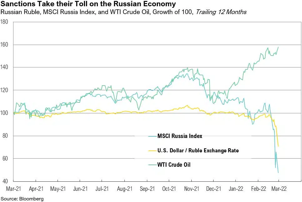 Despite the costs of sanctions to both sides, western powers gradually introduced more punitive measures to cut the Russian economy and financial system off from the rest of the world. Among the most severe was the removal of some Russian banks from SWIFT, a secure messaging system used for trillions of dollars’ worth of transactions around the world, essentially barring them from international transactions. This resulted in Russian citizens lining up at ATMs out of fears of cash shortages. Restrictions were also imposed on Russia’s central bank, attempting to prevent it from using its $643 billion of international reserves and ultimately freezing the assets of the bank completely. The E.U. also announced a total closure of E.U. airspace to all Russian aircraft, banned Kremlin-funded news sources from European airwaves, and extended new sanctions against Belarus, which has aided Russia in the invasion.13, 14 The E.U. also agreed to finance the purchase and delivery of weapons to Ukraine, marking the first time it has ever financed such measures in its history.15 The private sector also stepped in: British Petroleum (BP), the biggest foreign investor in Russia, abandoned its $25 billion stake in the state oil company Rosneft; Alphabet’s Google and Meta’s Facebook barred Russian media outlets from receiving money from ads on their websites, apps, and YouTube videos; and UPS and FedEx halted their delivery service to both Russia and Ukraine.16 In addition, MSCI, the sponsor of the widely used MSCI suite of global stock benchmarks, said that delisting Russia was “the next logical step.”17 These severe sanctions have sent both Russian stocks and the Russian ruble plummeting, down 67% and 33% year-to-date, respectively.