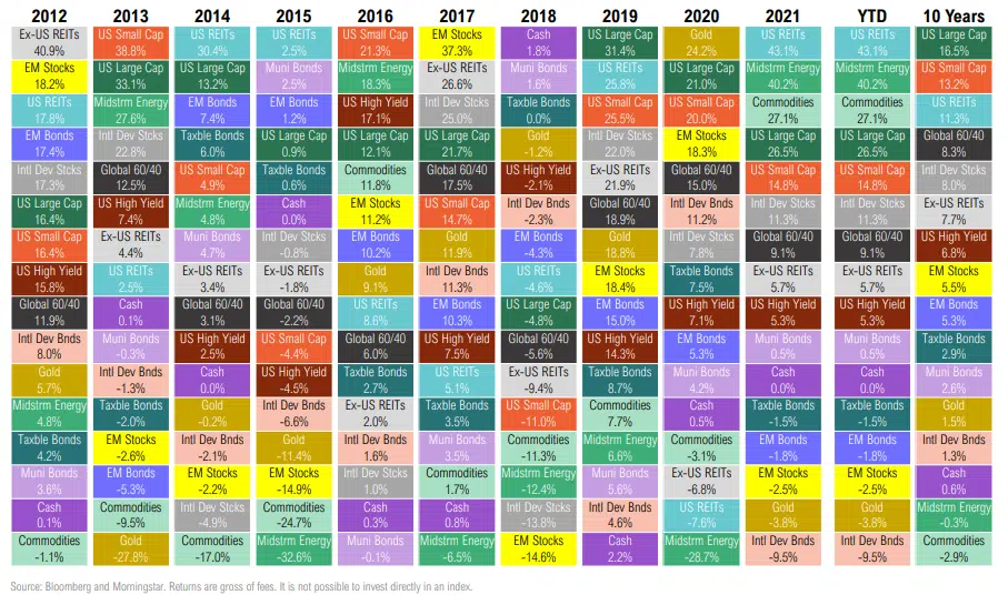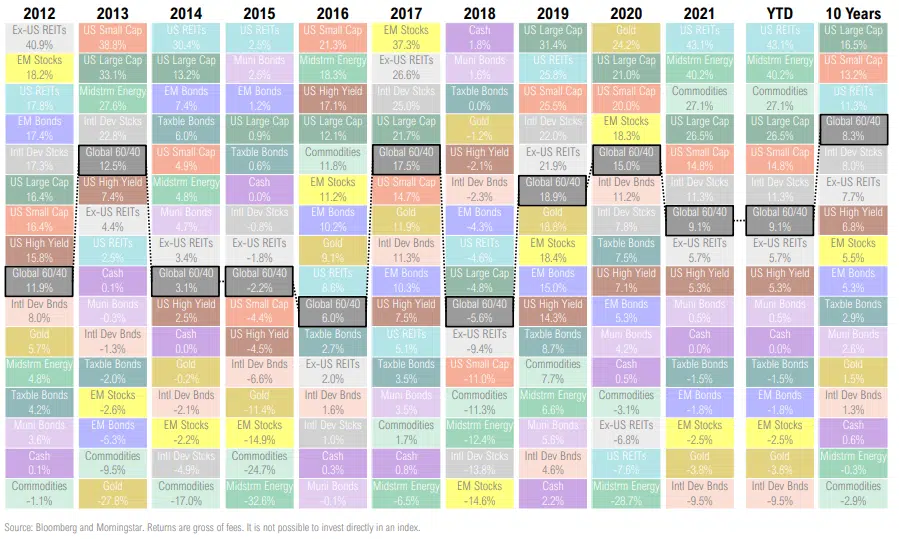 Diversification improves the investor’s long-term experience by not trying to pick the best (or worst) asset class in any given year