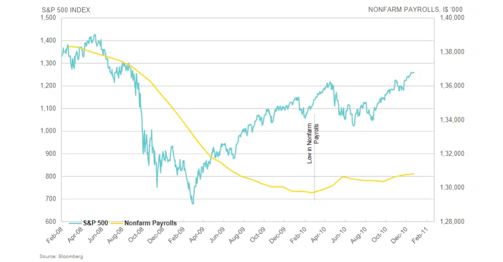 Labor is a lagging indicator: by the time the labor market bottomed in 2010, the stock market was already up almost 70%