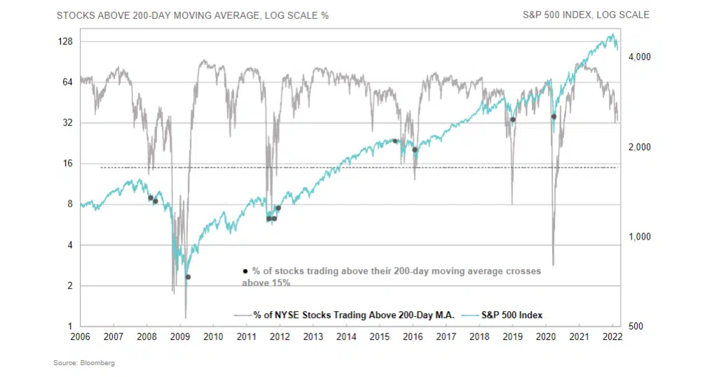 The percentage of stocks above their 200-Day M.A. has been falling since December of 2020