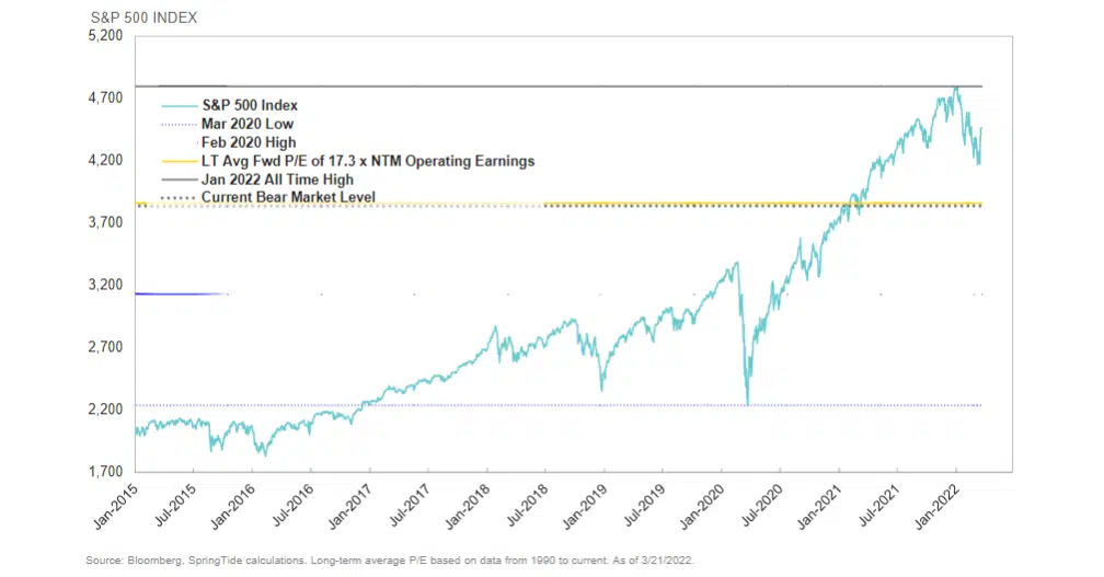 Markets have pulled back from ATH’s, but are still some way away from a bear market; interestingly, bear market level is inline with LT average market valuation