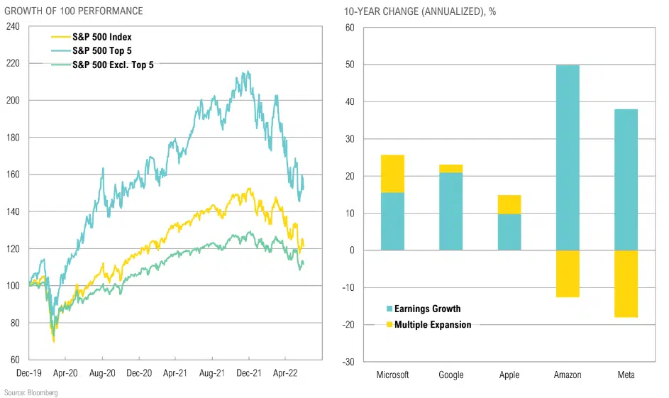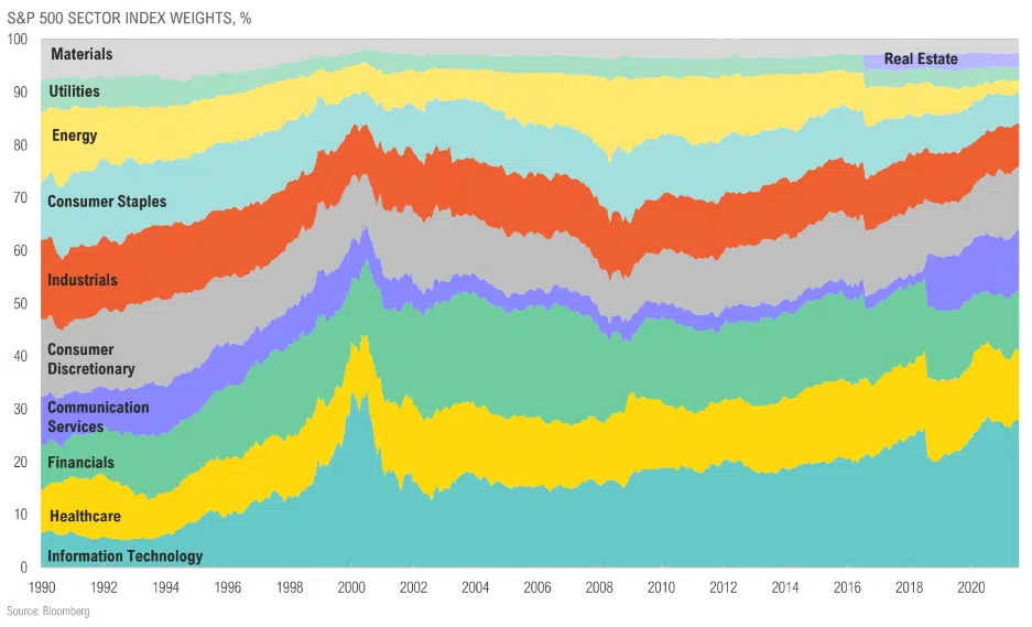 In the S&P 500, technology and comm services squeezed out traditional value sectors like energy & financials for much of the last decade