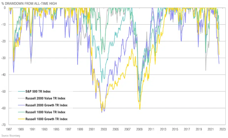 Value generally outperforms during risk-off periods, similar pattern playing out recently; small cap growth down over 30% from peak