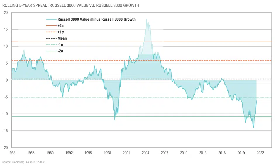 Value has outperformed growth year-to-date, but over the rolling five-year period still trails substantially