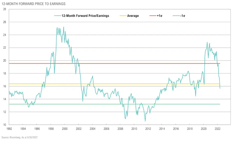 U.S. equity valuations approach longer-term average, as strong earnings growth and current bear market drawdown dramatically closes valuations
