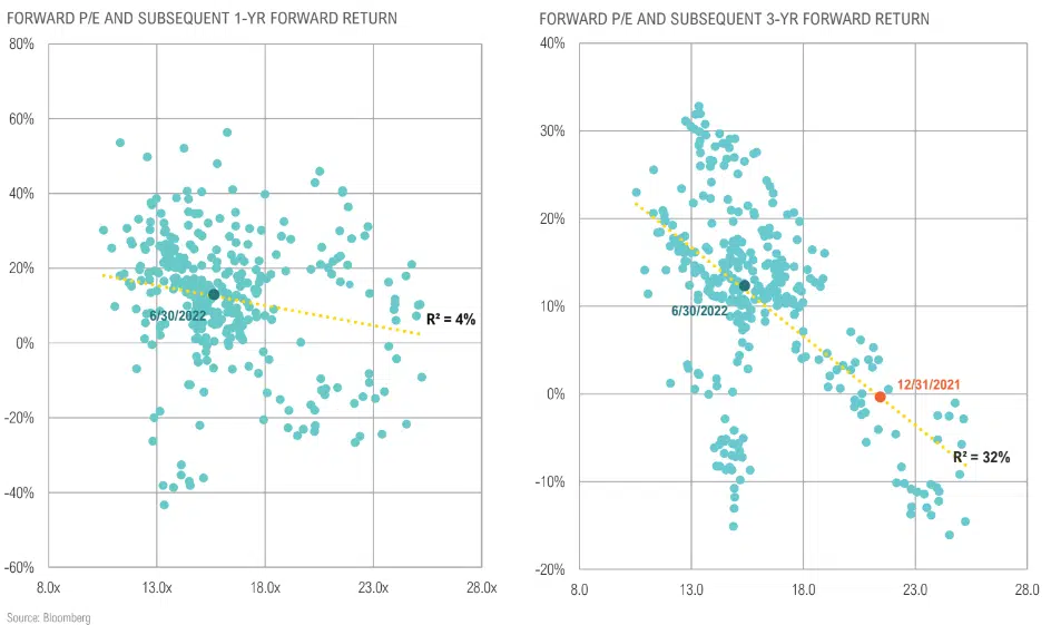 Forward P/Es have no predictive power for one-year forward equity returns, but have been reasonably predictive over longer time horizons