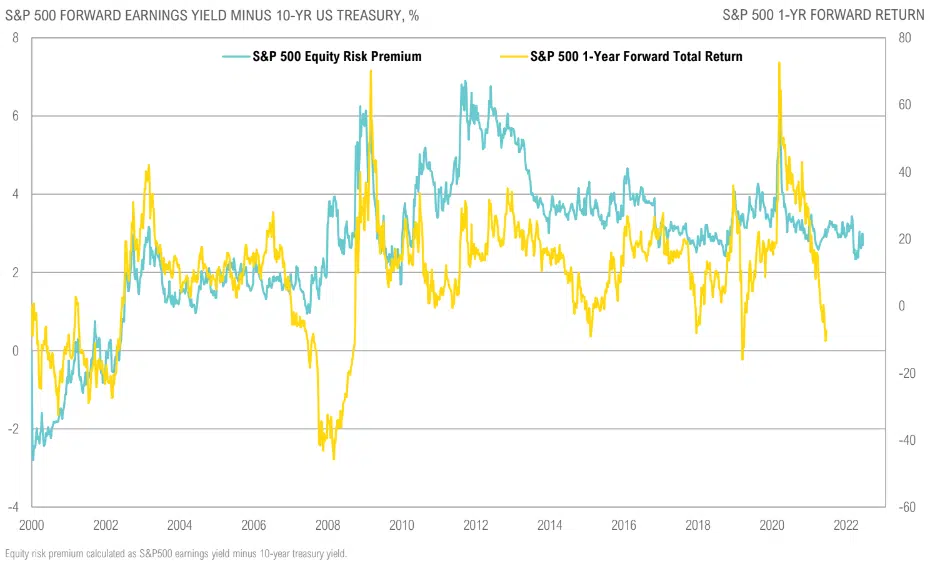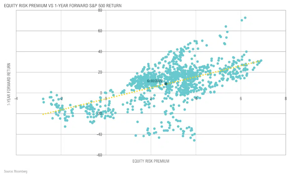 A loose correlation exists between the S&P 500 equity risk premium and 1- year forward returns; S&P 500 equity risk premium currently at 2.7%