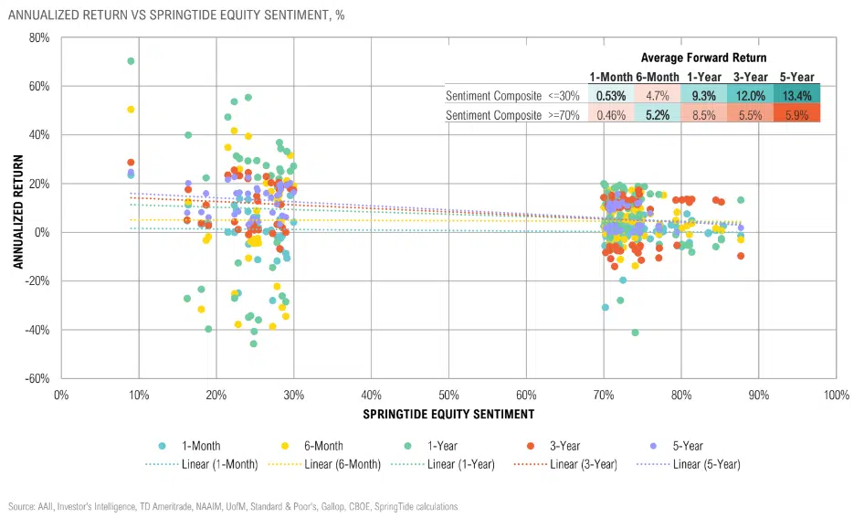 Average forward returns have been significantly higher when composite reading <30%; short-term range of returns however remains unpredictable