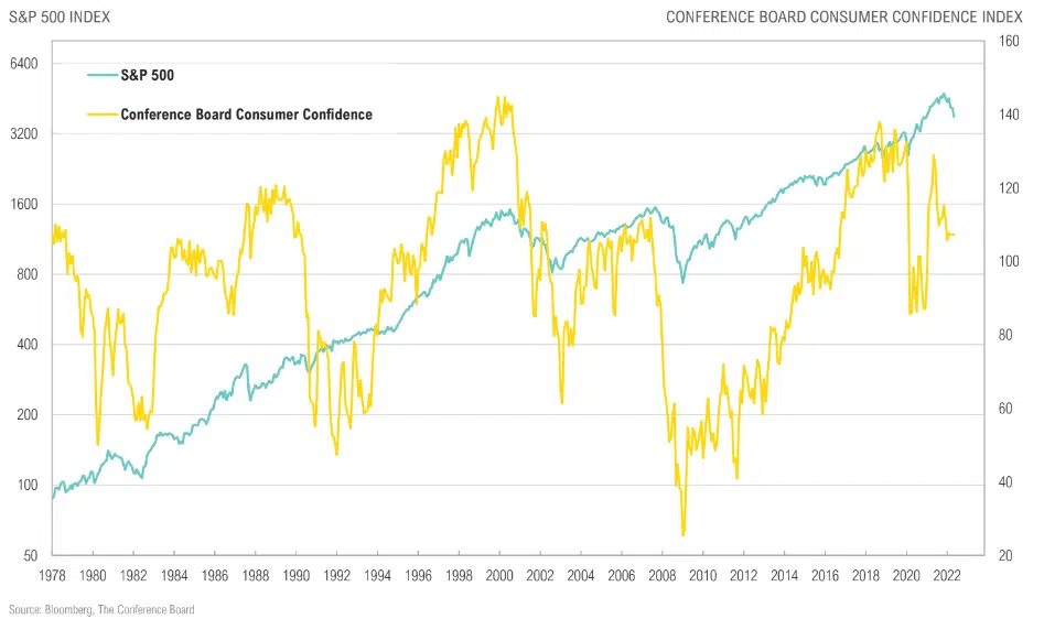 Consumer Confidence has trended lower over the past year, but remains elevated relative to consumer sentiment