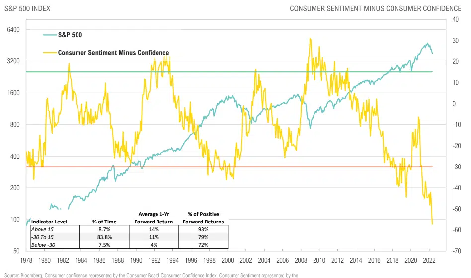 Historically, when Consumer Sentiment is at extreme lows relative to Consumer Confidence, U.S. equity performance has been poor; currently at record lows