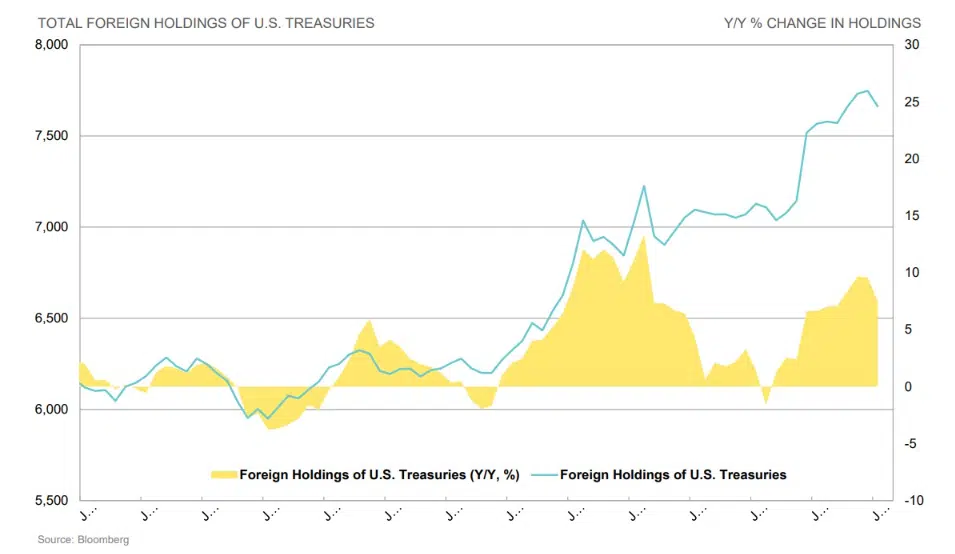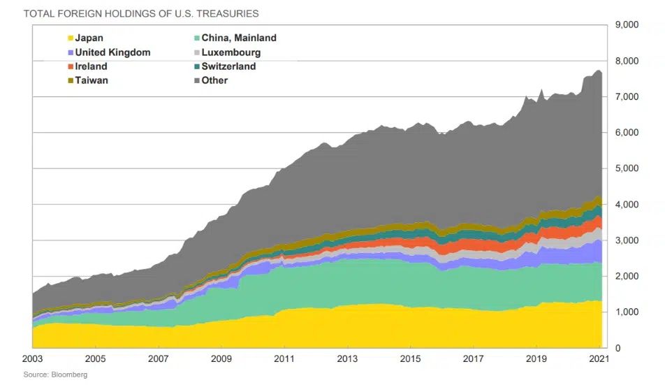 Japan, China and the UK are the largest holders of US treasuries, accounting for ~40% of foreign held bonds.
