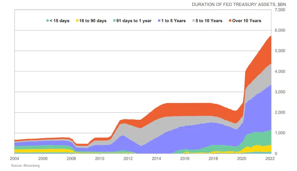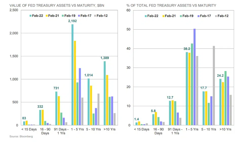 Roughly 20% of the Fed’s treasury assets mature within the next 12 months, amounting to >$1 trillion